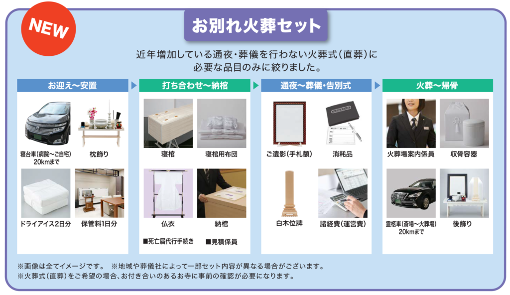 従来の基本セットに2つの葬儀セット(充実セット、お別れ火葬セット)を追加し、全3種類のセットからより柔軟にお選びいただける制度になりました。家族葬・一日葬など様々な形式に対応可能です。