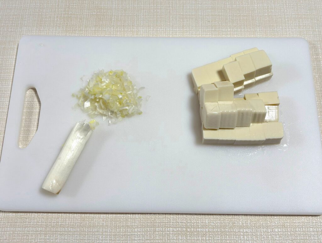 1.豆腐は水切りし、さいの目に切る。長ネギは粗みじん切りにする。片栗粉を水に溶いておく。