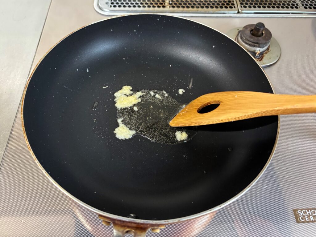 2.フライパンにゴマ油を熱し、生姜とニンニクを香りが立つまで炒める。