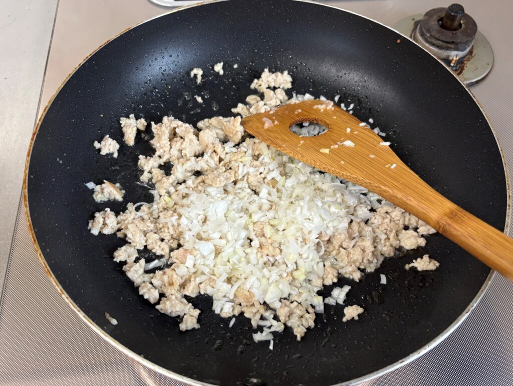 3.鶏ひき肉を加えて色が変わるまで炒めたら、長ネギを入れ、さっと炒める。