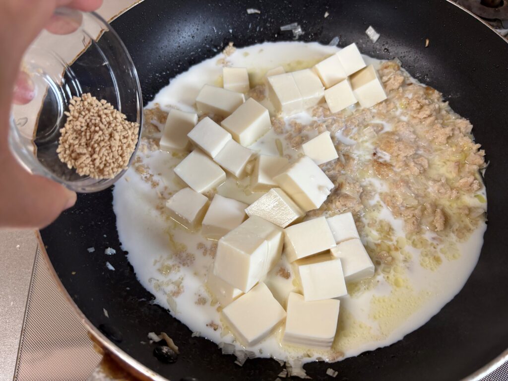 4.豆腐・牛乳・中華だしを加えて、ひと煮立ちさせる。花山椒を加えて混ぜ、水溶き片栗粉でとろみをつける。